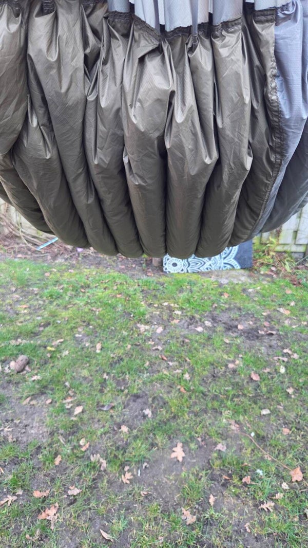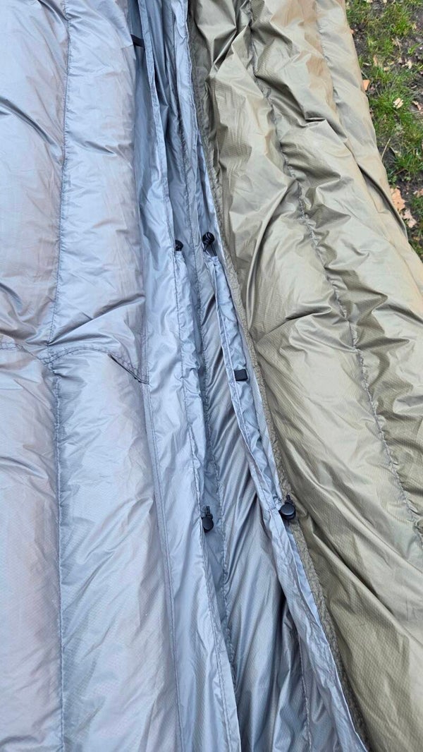 Ik zou het haast vergeten! De underquilt is 2 meter lang en 135 cm breed. Veel underquilts zijn 120 cm breed bij de schouders en 110 cm bij de voeten. Van gebruikers van dat type underquilt hoor ik terug dat je heel bewust recht moet liggen om te zorgen dat je in je underquilt slaapt.